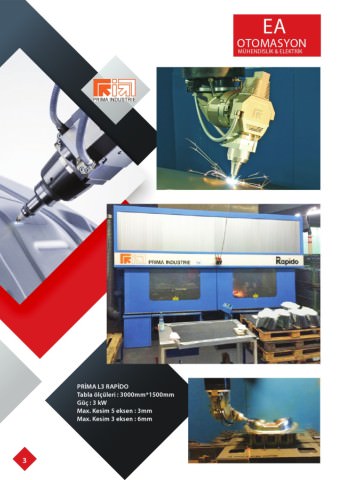 EA OTOMASYON MÜHENDİSLİK & ELEKTRİK PRİMA L3 RAPİDO Tabla ölçüler : 3000mm*1500mm Güç : 3 kW Max. Kes m 5 eksen : 3mm Max. Kes m 3 eksen : 6mm 3